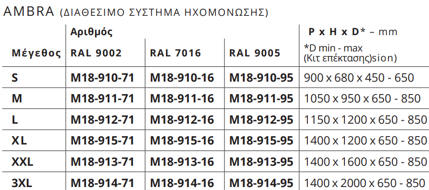 Προστατεύεται από επίστρωση πολυεστερικής σκόνης, ανθεκτική σε δοκιμές αλατόνερου έως και 500 ώρες εφαρμογής. Γρήγορη και εύκολη συναρμολόγηση σε λίγα λεπτά χάρη στο σύστημα γρήγορης απελευθέρωσης. Ρυθμιζόμενες προεκτάσεις για εύκολη τοποθέτηση σε τοίχο. Με τη γκάμα αξεσουάρ μας, οι επιλογές εγκατάστασης περιλαμβάνουν τοποθέτηση σε δάπεδο, τοίχο ή βάση.ΔΙΑΤΊΘΕΤΑΙ ΣΕ 3 ΜΟΝΤΈΛΑ ΚΑΙ 3 ΧΡΏΜΑΤΑ! ΤΟ ΚΙΤ ΗΧΟΜΌΝΩΣΗΣ ΑΠΟΤΕΛΕΊΤΑΙ ΑΠΌ ΗΧΟΜΟΝΩΤΙΚΆ ΠΆΝΕΛ ΠΟΥ ΜΕΙΏΝΟΥΝ ΤΟΝ ΘΌΡΥΒΟ ΤΟΥ ΜΗΧΑΝΉΜΑΤΌΣ ΣΑΣ ΈΩΣ ΚΑΙ 5 DB. Διατίθεται σε όλα τα μεγέθη του μοντέλου Ambra. Εύκολη εγκατάσταση χάρη στους προεγκατεστημένους μαγνήτες, δεν απαιτείται ειδικός εξοπλισμός. ΙΝΕΣ ΠΟΛΥΕΣΤΕΡΑΣ που προέρχονται από 100% ανακυκλωμένο PET. Διατίθεται σε μαύρο ή ανοιχτό πράσινο χρώμα για να ταιριάζει με το χρώμα του Design Box για μέγιστο αποτέλεσμα.