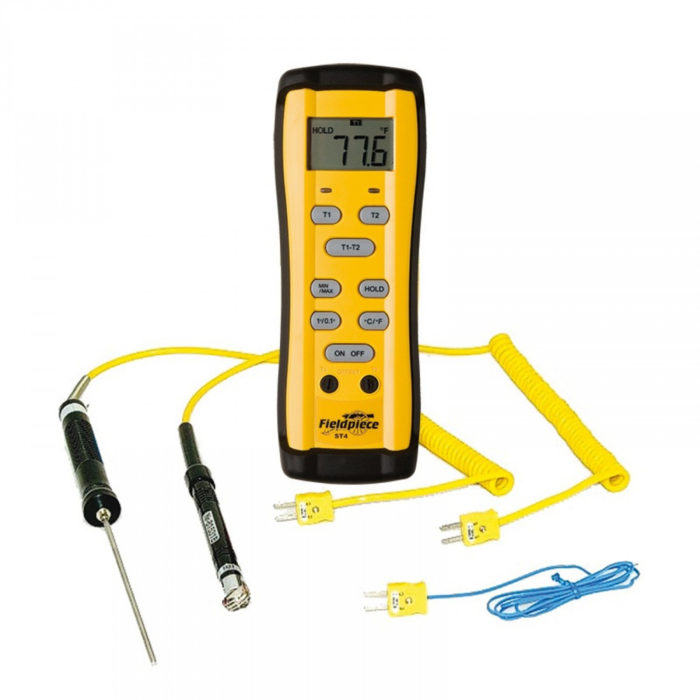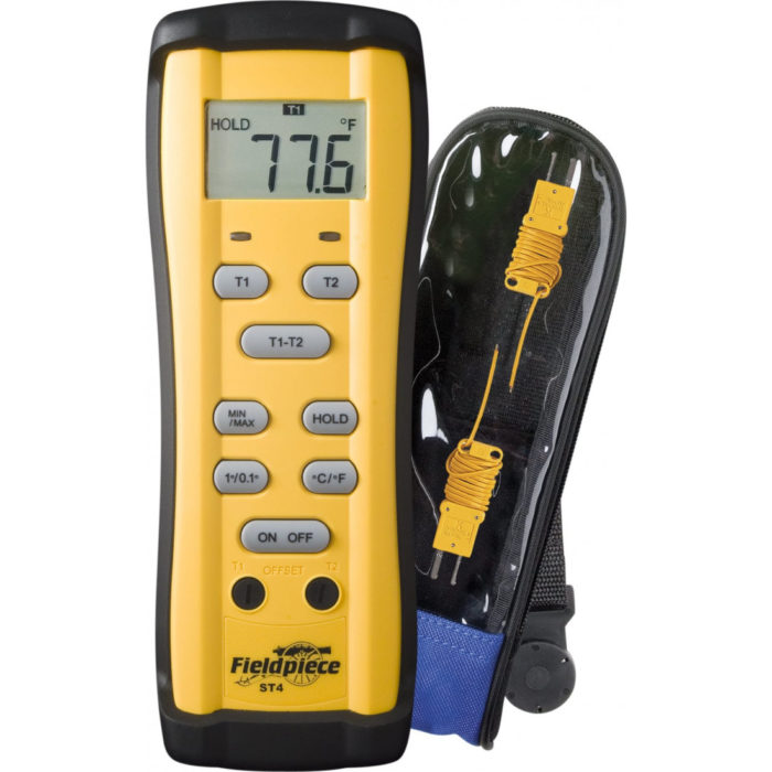 Ο μετρητής διπλής θερμοκρασίας ST4 της FIELDPIECE ,μετρά ταυτόχρονα δύο θερμοκρασίες χρησιμοποιώντας τα θερμοστοιχεία που περιλαμβάνονται Type-K, wrap-tab beaded. Βρίσκει το Delta T και το εμφανίζει σε μεγάλους, καθαρούς αριθμούς στην οθόνη LCD. Δύο θύρες βαθμονόμησης στο μπροστινό μέρος είναι εύχρηστες και η μαγνητική κρεμάστρα βοηθά να το λειτουργήσει οπουδήποτε το χρειάζεστε. Το προαιρετικό θερμοστοιχείο υγρού λαμπτήρα ATWB1 θα σας βοηθήσει να βρείτε την υπερθέρμανση-στόχο ή να χρησιμοποιήσετε τους σφιγκτήρες σωλήνων Type-K για να ελέγξετε για φραγμένα φίλτρα στεγνωτηρίου.